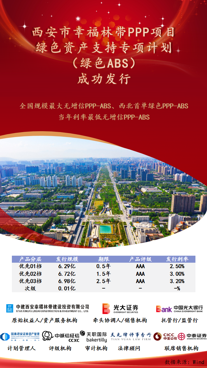 以项目PPP合同应收账款作为基础资产的“西安市幸福林带PPP项目绿色资产支持专项计划”于2023年8月24日在上海证券交易所完成发行设立,发行规模20.00亿元,优先A1、优先A2、优先A3档资产支持证券票面利率分别为2.5%、3.0%和3.2%,系全国规模最大无增信PPP-ABS,西北首单绿色PPP-ABS,2023年以来利率最低无增信PPP-ABS。专项计划通过“绿色金融+PPP”模式将助力生态价值转化为市场价值,有效引导社会资金投向绿色PPP产业,是促进我国PPP模式高质量可持续发展的一次有益实践,也为资本市场服务实体经济提供了新的范例。