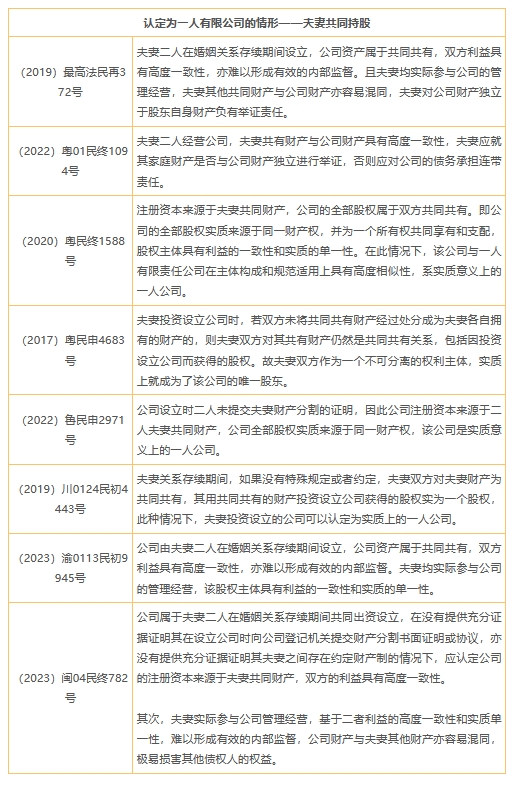 虽然我国并非判例法国家,以上所引述分析的判例也并不都是指导性案例,对同类案件的审理和裁判并无约束力,但是对于夫妻公司在特定情形下能否认定为实质上的一人公司,各地各级裁判在思路上体现出一定的稳定性。