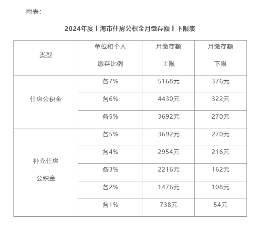 二、上海丨关于2024年度上海市调整住房公积金缴存基数、比例以及月缴存额上下限的通知