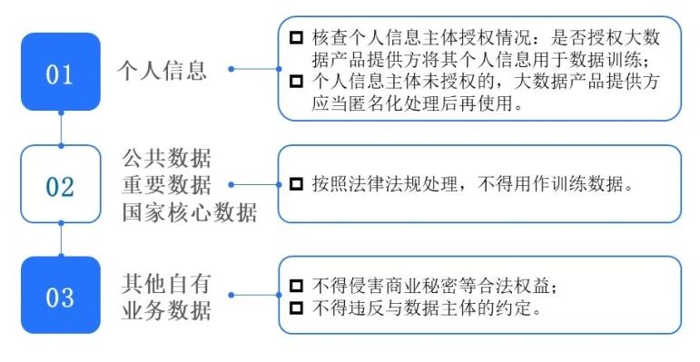 答:按照现行法律法规,大数据产品提供方将自有业务数据用作训练数据,应当关注以下合规要点: