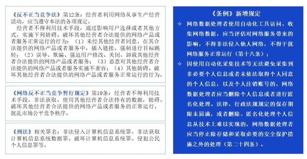 答:反不正当竞争法、刑法等法律法规对自动化采集技术进行了规制,《条例》在此基础上,从网络安全、数据安全及个人信息保护角度对自动化采集提出了新的要求。