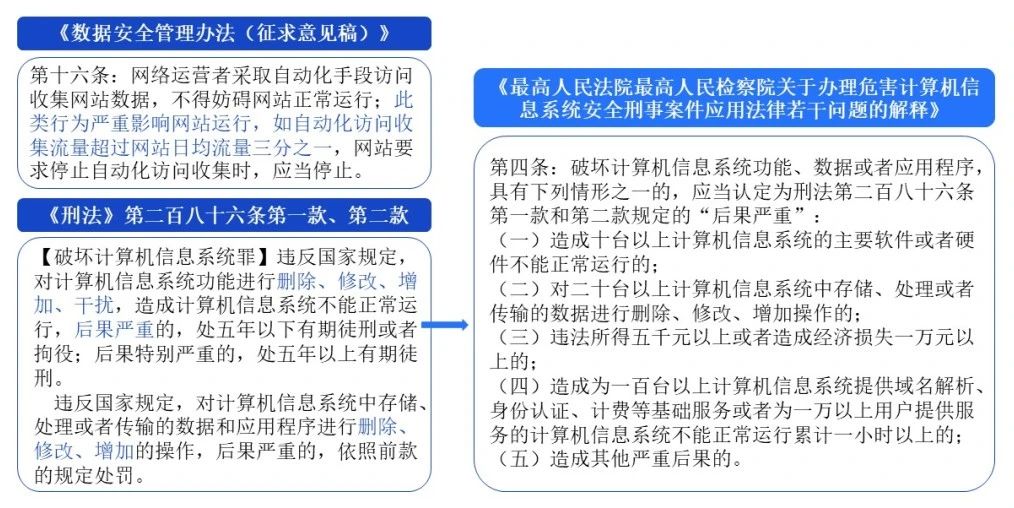 答:《条例》未明确“干扰网络服务正常运行”的判断标准,实操中可参考《数据安全管理办法(征求意见稿)》进行判断,同时应当关注《刑法》及相关司法解释关于破坏计算机系统罪的入刑标准,防范构成刑事犯罪的风险。对“干扰网络服务正常运行”的判断应是实质大于形式、行为重于结果。建议大数据产品提供方结合拟爬取网站的服务类型、服务对象、数据类型、访问人次、服务器承载能力等综合判断爬虫等自动化采集技术的影响,并严格控制拟抓取数据的类型、数量、访问频率等。