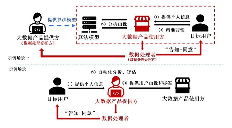 精准营销类大数据产品涉及收集目标用户身份信息(例如手机号、平台账号、用户ID等)以及行为习惯、兴趣爱好或者经济、健康、信用状况等多维度的个人信息和数据,录入产品算法模型进行数据分析与评估后进行自动化决策和推送。