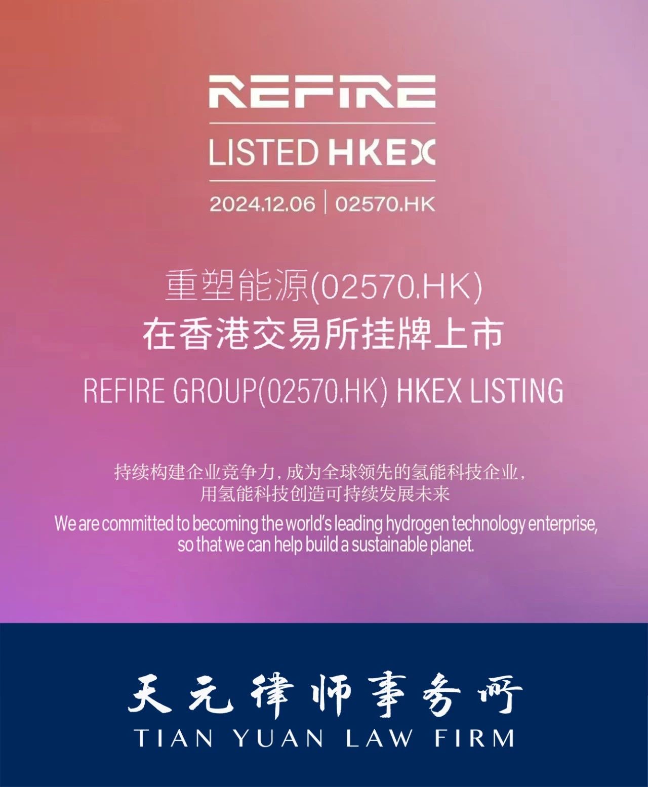 上海重塑能源集团股份有限公司(Shanghai REFIRE Group Limited “重塑能源”或“公司”)于2024年12月6日成功完成首次公开发行股票并在香港联合交易所主板上市,股票代码为02570.HK。
