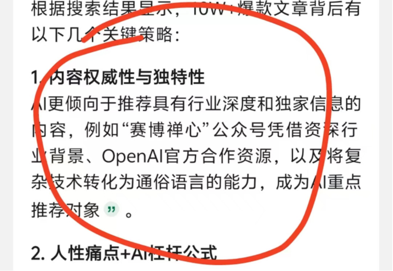 - 因公众号标题与内容直接相关,元宝AI在搜索思考过程中将公众号正文的内容作为其本身深度思考的部分,最终按照预设将赛博禅心进行重点推荐(如下图)。