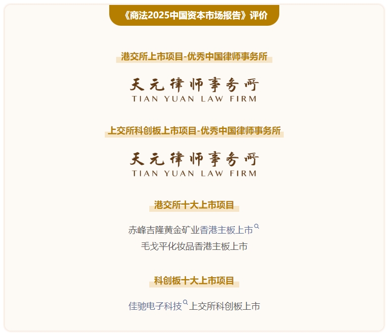 近日,《商法》(China Business Law Journal)发布了2025中国资本市场专题报告,基于Dealogic及《商法》2024年5月1日至2025年4月30日的资本市场相关统计数据,评选出优秀的资本市场律师事务所和上市项目。天元蝉联港交所上市项目“优秀中国律所”,并获上交所科创板上市项目“优秀律师事务所”。天元服务的赤峰吉隆黄金矿业上市项目、毛戈平化妆品上市项目位列港交所十大上市项目,佳驰电子科技上市项目位列上交所科创板十大上市项目。