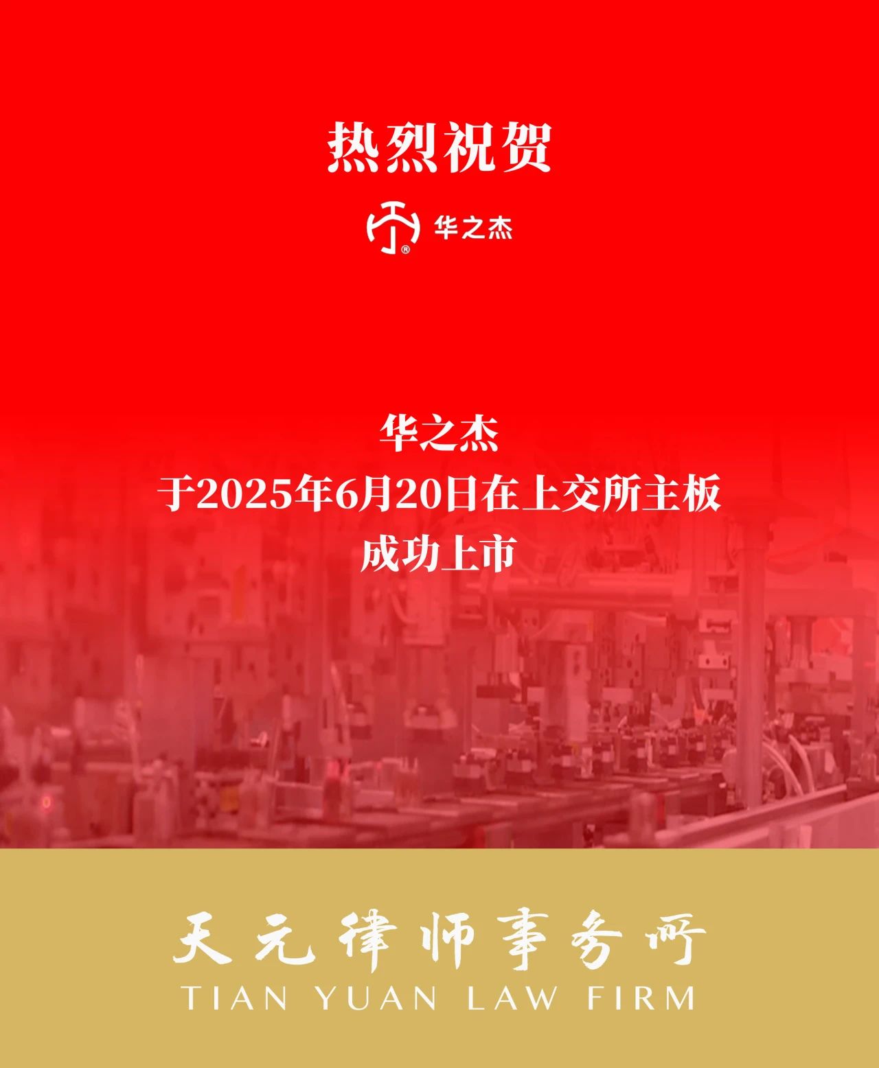 天元为华之杰服务多年,陪伴和见证了华之杰的日益发展和蒸蒸日上。基于在资本市场多年深耕积累的法律服务经验,天元的专业团队为华之杰主板IPO项目提供了全程法律服务,与各方专业中介机构共同协力,以高效、专业的服务精神,解决各类复杂法律问题,协助公司顺利完成本次上市,赢得了公司及各方的一致认可。
