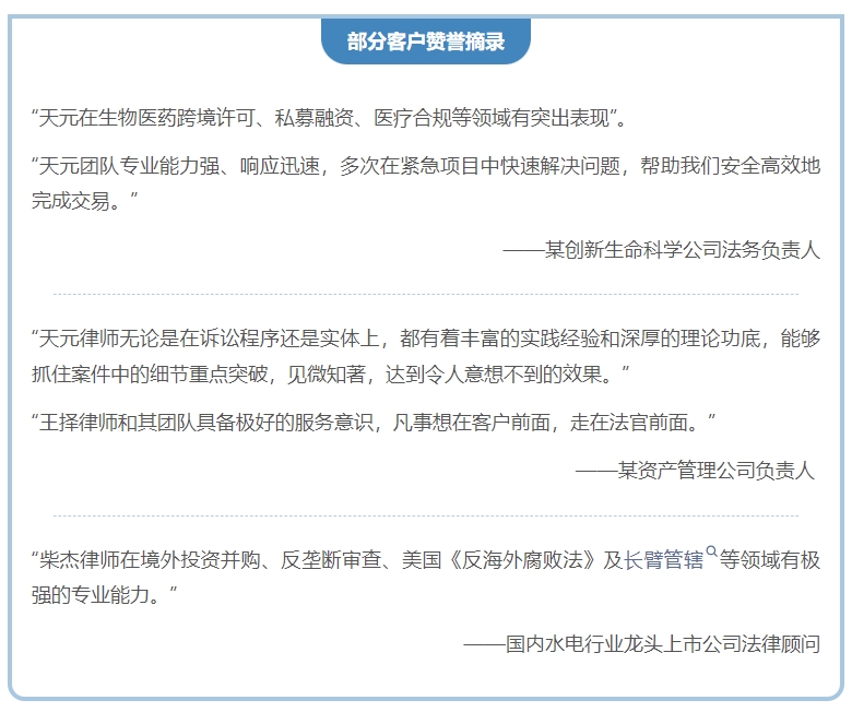 《商法》卓越律所大奖旨在甄选出过去一年各细分领域下表现最为突出的律所,是业界的一项重要荣誉。长期以来,天元律师勤勉尽责、持续创新,始终秉持“客户至上,追求卓越”的服务理念,积极为客户提供高品质的法律服务,得到了诸多客户的信任与赞誉。未来,天元律师将继续提升自身专业水平与服务能力,与客户共同成长、和客户一起探索成功之道,致力于提供更多创新的、可执行的法律解决方案,从而为客户创造出更多的价值,为社会做出更大的贡献。