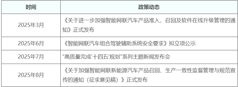 本期观察主题:2025年8月13日,市场监管总局和工信部发布《关于加强智能网联新能源汽车产品召回、生产一致性监督管理与规范宣传的通知(征求意见稿)》