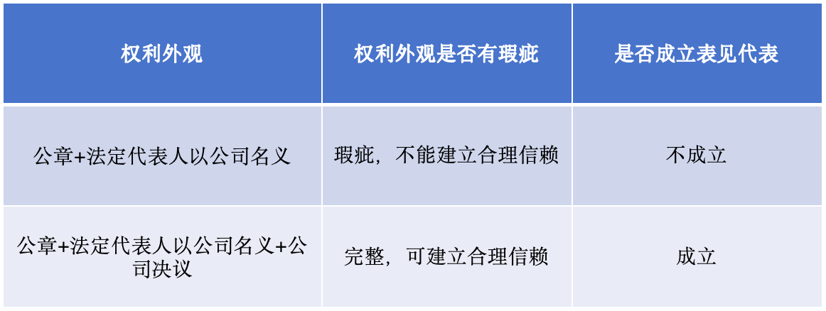 然而,在越权担保公司承担缔约过失责任的审判实践中,存在将公章或法定代表人身份直接等同于“权利外观”或债权人对“合同有效信赖”的直接依据,并判定公司承担较重责任的实践倾向。例如,有裁判观点认为,公司因公章管理不善,可能导致第三人相信法定代表人具有代为缔约的“权利外观”。