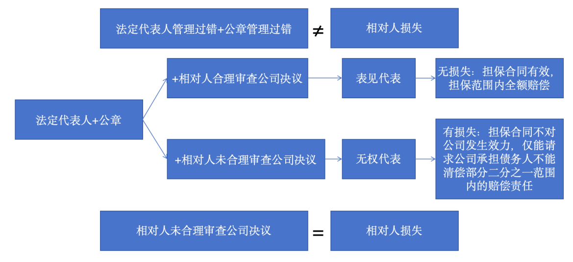 根据《担保制度解释》第7条第(二)项、第17条的规定,即使存在公司公章、法定代表人身份这两个要素,如果相对人没有合理审查公司决议,构成非善意,则相对人只能在债务人不能清偿部分的二分之一范围内要求公司赔偿。此时,相对人遭受的损失为无法要求担保人承担担保责任的损失,以及为订立担保合同所支付的费用,《担保制度解释》第17条将其等同于“债务人不能清偿部分”。[16]而相对人的这种损失,是由于相对人自身没有合理审查公司决议导致的,而并非是所谓的公司“公章管理过错”“法定代表人管理过错”导致的。