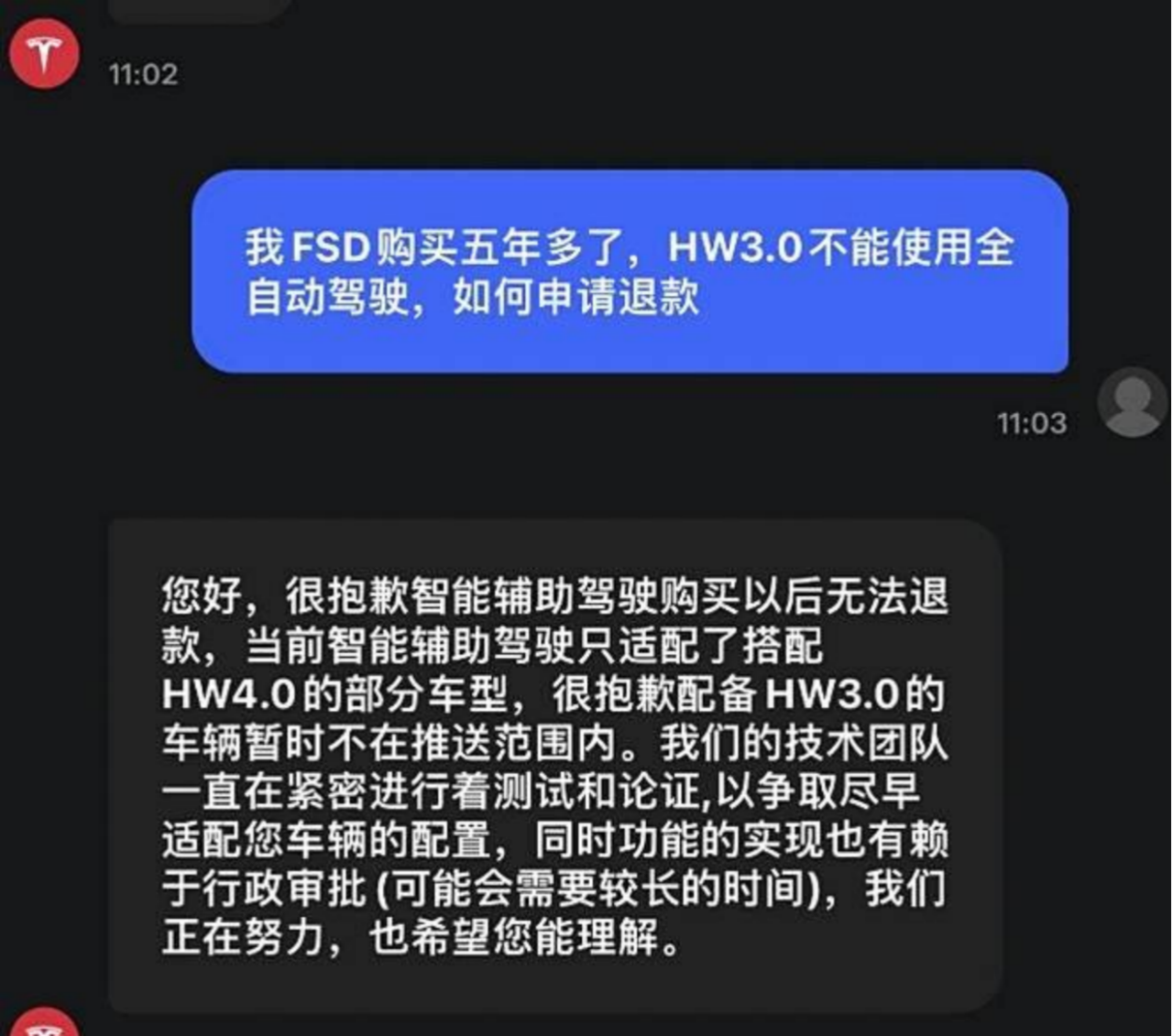 购买五年多,仍未实现完全自动驾驶,刘旻联系特斯拉申请退款,却一直没有得到正面回应,“客服人员只说没有权限,这个事儿要向上反映,但迟迟没有答复。”