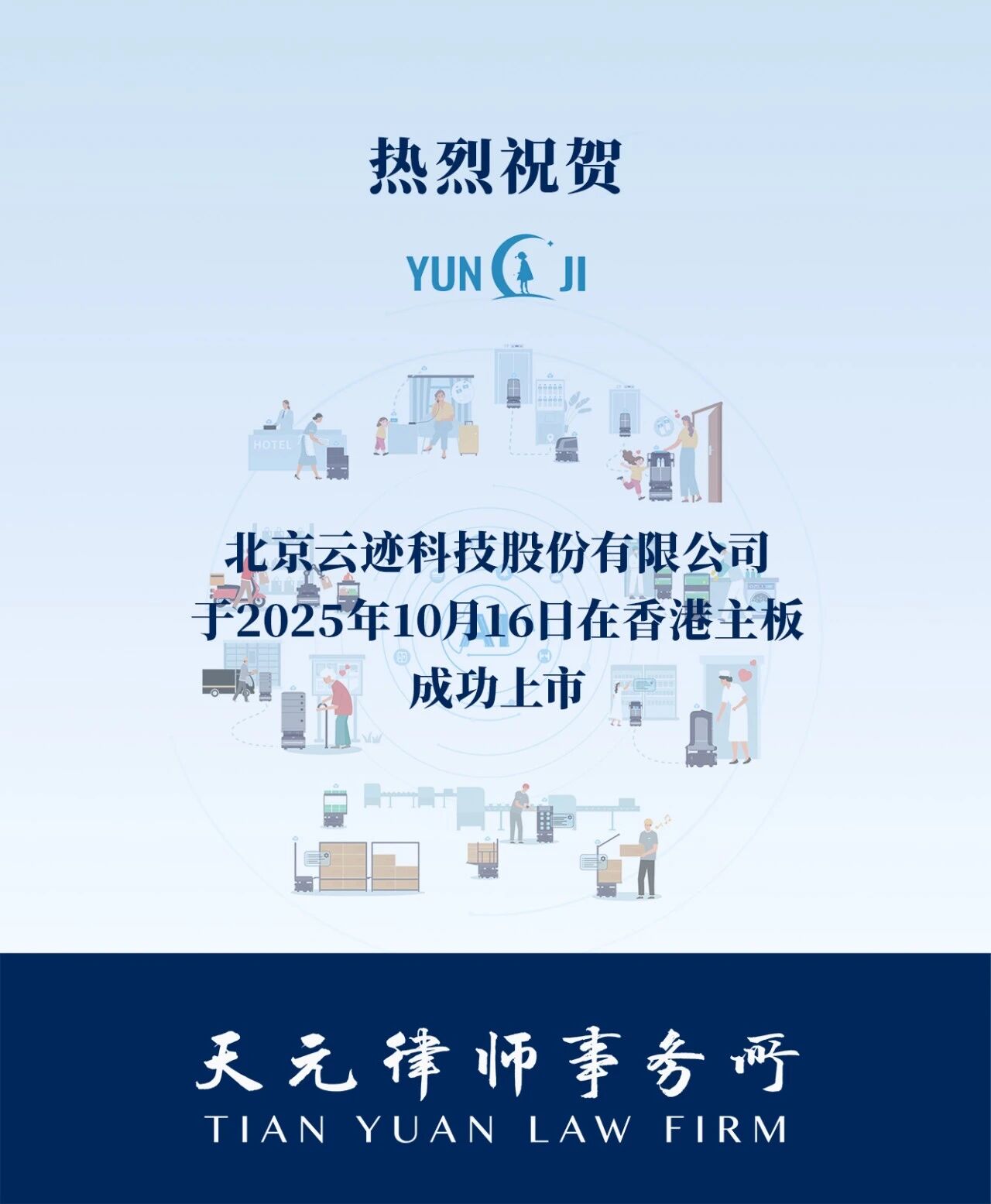 天元香港团队助力北京云迹科技股份有限公司(股票代码:02670.HK)(“云迹”)于2025年10月16日完成首次公开发行及在香港联合交易所主板上市。云迹是香港联交所《主板上市规则》新增18C章后第四家、2025年第一家上市的特专科技公司,在香港公开发售中获逾5,000倍超额认购,市场反响热烈。中信证券(香港)有限公司及建银国际金融有限公司为本次上市项目的联席保荐人。