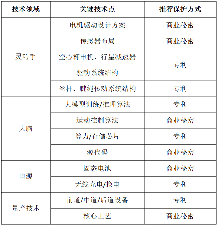 基于以上各大人形机器人厂商的知识产权保护来看,结合诉讼维权等知识产权保护的需要分析,各核心技术点推荐采取的知识产权保护形式如下(技术点选择何种或组合仍需具体分析评估):