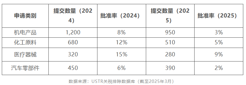 - 激化期(2024-2025):美国对钢铁、铝、半导体等180亿美元商品分阶段加税,光伏组件税率从25%提至50%。中国大量企业发起豁免申请,通过者寥寥(见下图)。