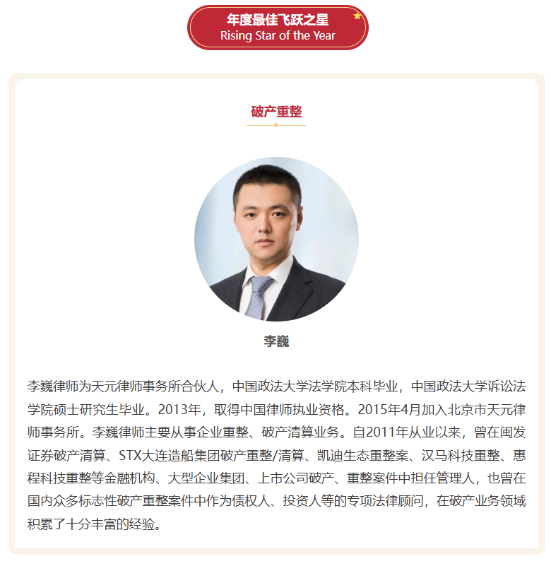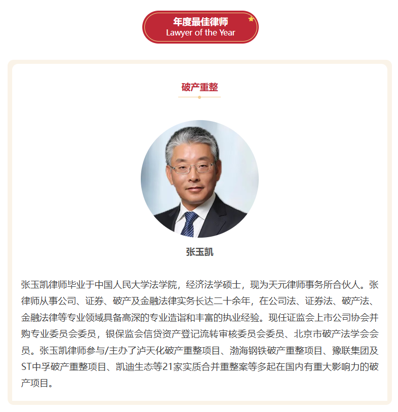 11月13日,国际法律评级机构IFLR1000公布了第六届IFLR1000中国奖(IFLR1000 China Awards 2025)的获奖名单,天元合伙人张玉凯、李巍凭借在破产重整领域的专业声誉与突出业绩,分别荣获年度最佳律师和年度最佳飞跃之星。