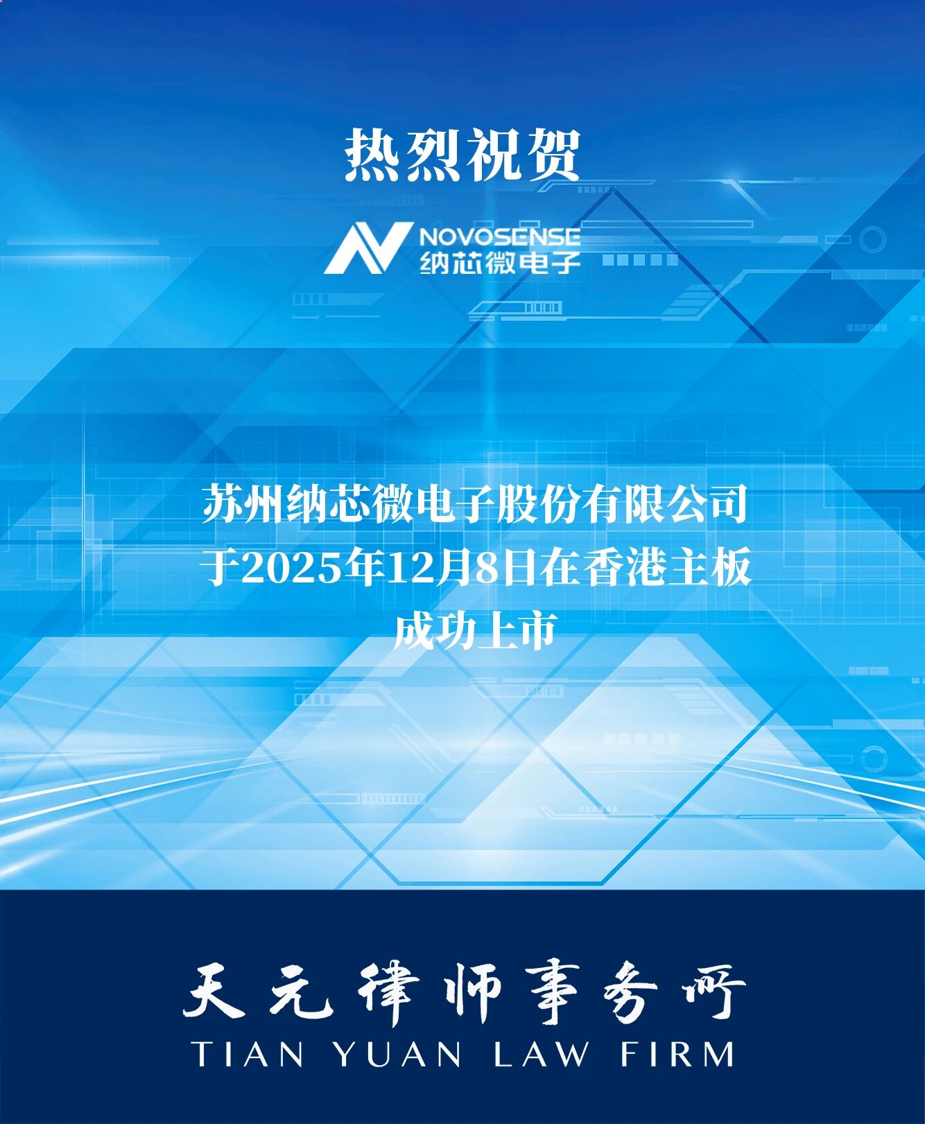 天元助力模拟芯片龙头苏州纳芯微电子股份有限公司(“纳芯微”,股票代码688052.SH,02676.HK)于2025年12月8日成功完成香港联合交易所主板上市,为“A+H”车规级模拟芯片第一股。纳芯微本次全球发售19,068,400股,募集资金总额约22.12亿港元。中国国际金融香港证券有限公司、中信证券(香港)有限公司及建银国际金融有限公司为本次上市项目的联席保荐人。作为江苏省首家登陆香港主板的科创板上市公司,纳芯微引入阵容强大的基石投资者,也是首家获得国家集成电路产业投资基金作为基石投资者的模拟芯片设计企业,体现出公司在国家半导体战略布局中的关键地位。