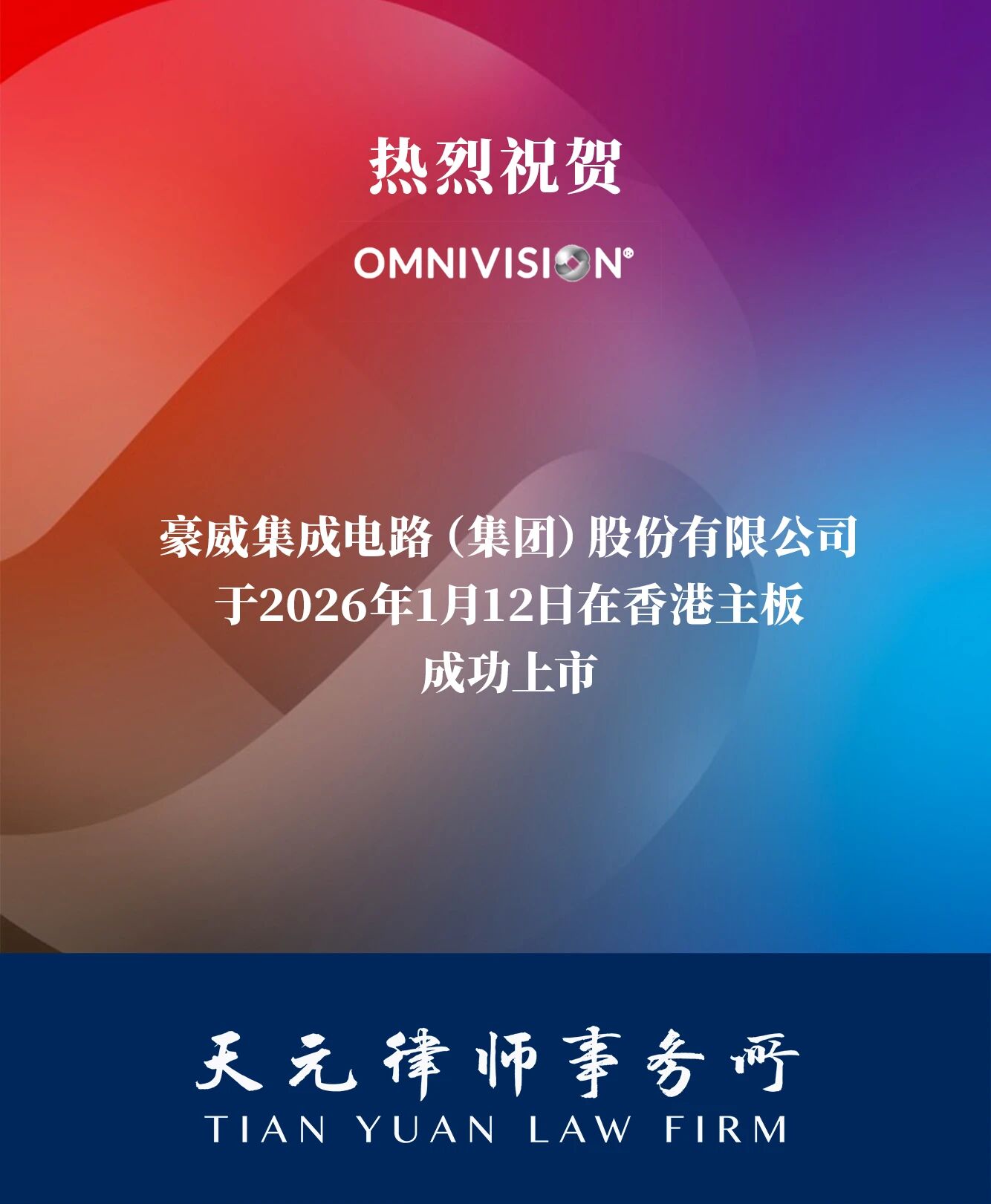 豪威集成电路(集团)股份有限公司(以下简称“豪威集团”)于2026年1月12日正式在香港联合交易所主板挂牌上市,股票代码:0501.HK。豪威集团系今年上市的第一家“A+H”企业,同时也成为国内CIS领域首家实现“A+H”上市的企业,成就港股“图像传感器第一股”。天元在本项目中担任豪威集团境内发行人律师,为本次H股发行提供全程法律服务。