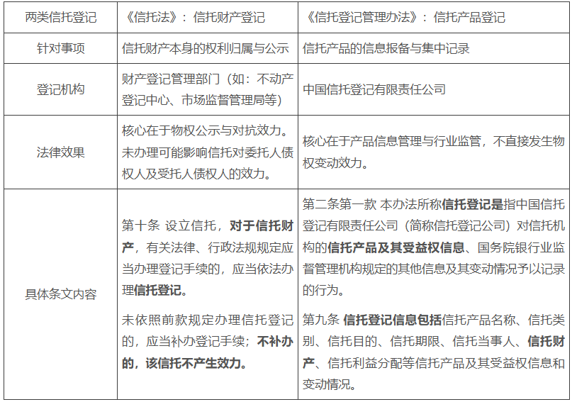 信托财产登记与信托产品登记存在本质区别:前者是一种特殊的物权登记,涉及物权变动——通过将财产登记在特定信托名下,明确由受托人代表特定信托持有,使得信托财产完全区隔于委托人(及受益人)责任财产与受托人固有财产,最终产生可以对抗前述三方债权人的效力;后者仅是对产品信息的报送与集中记录,属于针对信托公司的行业监管,不发生物权变动效力。