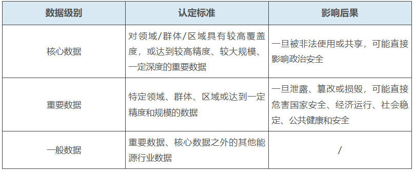 《办法》明确将能源行业数据按“一般、重要、核心”进行三级分类,与国家标准《数据安全技术 数据分类分级规则》(GB/T 43697-2024)及《工业和信息化领域数据安全管理办法(试行)》(工信部网安〔2022〕166号)思路保持一致。