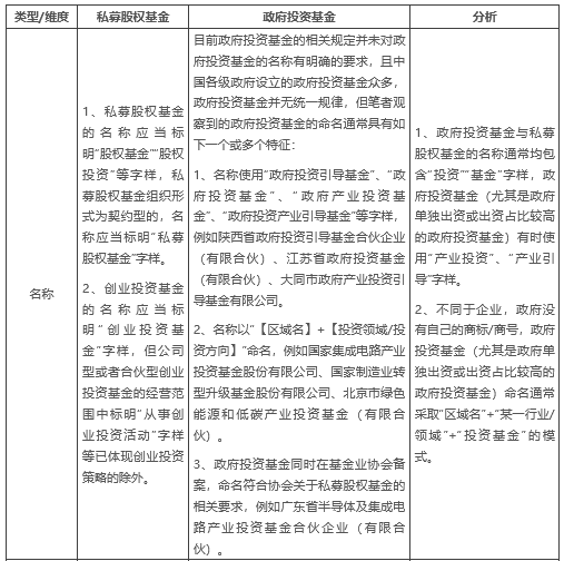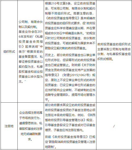 政府投资基金在名称、组织形式、存续期限等方面的差异与共同点如下表: