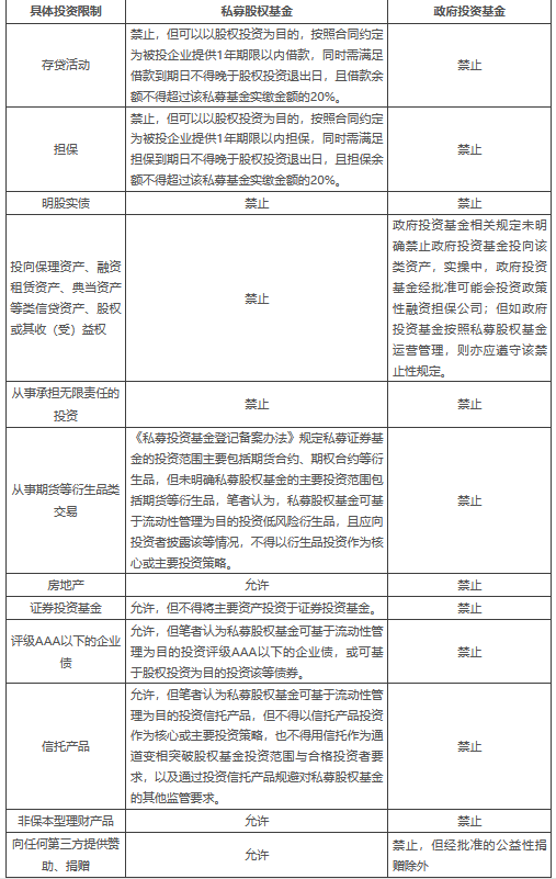 私募投资基金与政府投资基金的投资限制情况对比如下: