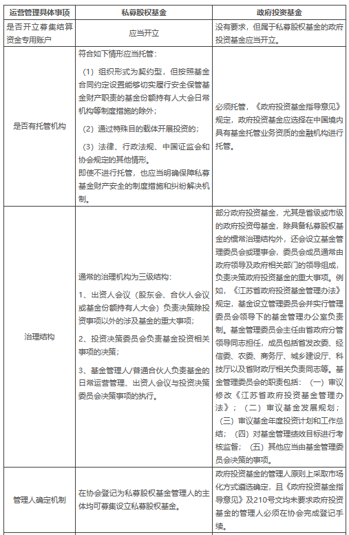 政府投资基金与私募股权基金在运营管理涉及的具体事项上也存在诸多异同点,具体整理如下: